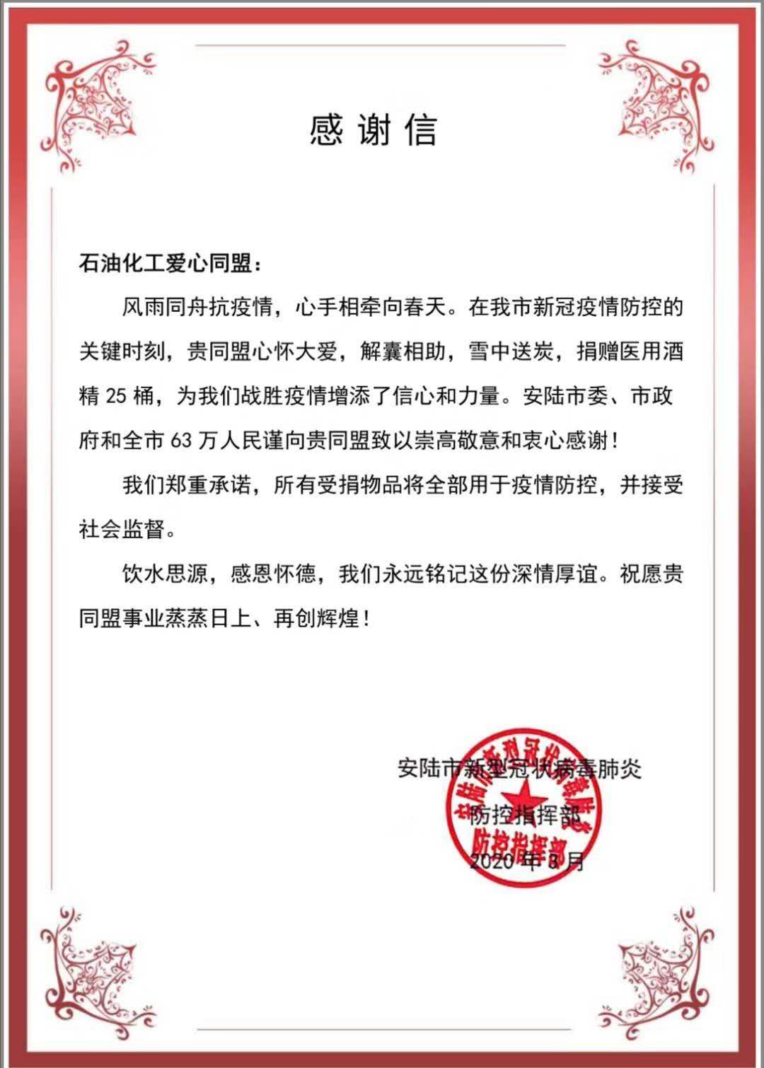 “風(fēng)雨同舟抗疫情,心手相牽向春天。在我市新冠疫情防控的關(guān)鍵時(shí)刻,貴同盟心懷大愛(ài),解囊相助,雪中送炭,捐贈(zèng)醫(yī)用酒精25桶,為我們戰(zhàn)勝疫情增添了信心和力量。安陸市委、市政府和全市63萬(wàn)人民謹(jǐn)向貴同盟致以崇高的敬意和衷心感謝!”2020年3月,湖北省安陸市委、市政府向石油化工愛(ài)心同盟發(fā)來(lái)感謝信,對(duì)同盟在抗擊疫情過(guò)程中,對(duì)安陸市的酒精捐助表示敬意和感謝。